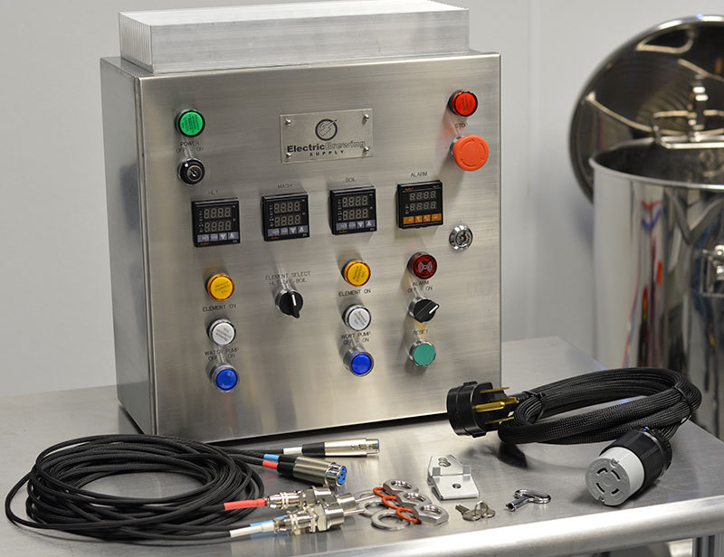 - Hit the ground running with one of our complete control panels. Save your time and energy, and let Electric Brewing Supply help you get a jump on your electric brewery. Due to the custom nature of these, delivery will varyAlways subject to prior orders. Average lead is approx 4-6 weeks, during busier seasons this can stretch to 8. Now available in 220v variants for Europe and Australia Hit the ground running with one of our complete control panels. Save your time and energy, and let Electric Brewing Supply help you get a jump on your electric brewery. Electric Brewing Supply does the work so you don't have to. Featuring a fully configured 30a Control panel, ready to be mounted on the wall and plugged in. Protects your elements from accidental firing while brewing with a selector switch controlling which element is controlled. Have a problem? Wort pumping all over the floor? Forgot a hose? The red mushroom stop button halts all functions, without cutting your brew day short. Each panel features an interlocking relay, for safety from accidental power up of elements or dry pumping. When the e-stop or key switch are turned on, this relay reacts by either shutting off power to the pumps and elements (therefore appear dead) or it allows power to flow. Additionally, this relay works in conjunction with the e-stop switch, and therefore, protects the hardware even while still leaving you the ability to take corrective action on the still powered PIDs. Specifications: Stainless steel enclosure with ID tagging via Engraving for easy clean up of door. Underside is tagged using black/white tags 30a, 240v electric, single phase (for safety, please use GFCI protection) 30a Twist lock power in supply to plain wire end or 4 prong washer/dryer plug, 6 ft wire Love 16C PID Controllers with manual mode enabled for boil with Love LCT216 Timer 2 L6-30 Flanged outlets for 240v Elements upto 5500w 2 L5-15 Flanged outlets for 120v for pumps such as Chugger or March, plugs included with panel 3 temperature probe inputs via XLR connection 3 RTD temp probe cables, with shielding and black poly sleeving. Color coded heat shrink. 3 RTD 1.5" long temperature probes with Stainless steel 1/2" NPT washer and locknuts for weldless mounting or in plumbing mounting Key style power switch for secure storage Locking mushroom button stops all power to elements and pumps What will you need aside from the panel to get going: 4500w or 5500w element in protective enclosure to attach to kettle Available here 30a GFCI protected, single phase 240v electric service to brew area. Electrician installed highly recommended. 1-2 Pumps with plugs changed to twist locking L5-15 plug. Plugs are provided in package (jumper cable recommended to avoid voiding warranty) Kettles to your liking Once you have your panel in place, it is highly recommended that you run auto-tune to improve your brewing performance. More regarding the PID Units The compact Series 16C Temperature Controller offers accurate temperature measurement and control in a 1/16 DIN package. Designed for direct or reverse acting (cooling or heating) control, the Series 16C can be programmed for simple ON/OFF or more complex PID control functions. PID control is supported with manual or auto-tuning. The Series 16C accepts a variety of thermocouple and RTD inputs. Process value and setpoint value are displayed simultaneously on the large dual LED. Auto-tuning, engineering units (°F or °C), and alarm status is also indicated on the faceplate. Two alarm outputs are included on the unit with 12 preprogrammed alarm functions.