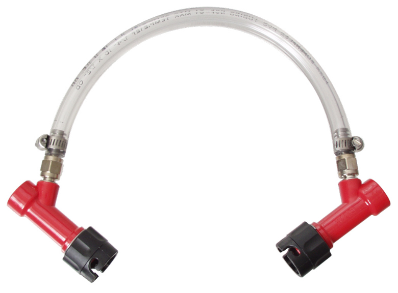 Push product or sanitizer from one keg to the next. Two red, beverage quick disconnects with flare fittings attached via a one foot piece of beverage line.Ideal for transferring beer off settled yeast to another keg known as the 'bright tank'.