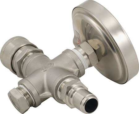You likely want to monitor the temperature of your wort as it moves from the chiller to the fermenter, and now you can do just that with this In-Line Thermometer from MoreBeer! This high quality thermometer features stainless steel quick disconnects for easy installation in line with the rest of your brewing system, and many users install it on the “out” side of their convoluted heat exchangers and counterflow chillers.,As the wort runs through the body of the in-line thermometer it runs across the 2-inch thermometer probe, giving an instant and incredibly accurate reading of its exact temperature. Ryan Barto, our Fulfillment Operations Manager and also the thermometer’s inventor, says that this handy device will help you to keep better control of your mash temperatures, and makes it easier to transfer your wort to your conical through the counterflow chiller.