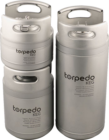 Set your sights on a brand new Torpedo Keg! The sleek all-stainless design represents a new era of homebrew kegs. With features like welded stainless handles, the ability to stack with fittings in place, amazing quality and a great price we think these kegs will become the standard by which other kegs are measured.   ,Quality First,The first thing we at MoreBeer! check out is interior welds. We've spent a decade rejecting kegs made overseas because the interior welds have never met our standards. If a weld is not perfect and shows evident burn marks along with nooks and crannies it cannot be sanitized effectively. Torpedo kegs are machine welded and exceed our standards for quality. The weld quality is possible because these kegs made by an ISO certified commercial keg manufacturer.,Cool Features,Torpedo Kegs were designed to stack with Ball Lock quick disconnects in place and serving which is a cool feature for some brewers who have vertical space in their refrigerator. We also like the rolled stainless steel handles. They are comfortable to grab and will never come off like some rubber handles can over time. In and Out is etched near the keg posts for easy identification which is very handy when you are connecting lines in a refrigerator or kegerator and trying not to make a mistake. ,Overall for the price and quality, along with free shipping from MoreBeer!, the Torpedo Keg is an amazing value!,Dimensions:,,,,,,,,,,,,,,,,,, ,,,,,,,Height (in.),,,,,,,Diameter (in.),,,,,,,,,,,1.5 Gal,,,,,,,10,,,,,,,9.125,,,,,,,,,,,2.5 Gal,,,,,,,14.5,,,,,,,9.125,,,,,,,,,,,5 Gal,,,,,,,22.75,,,,,,,9.125,,,, ,Please Note: These are about 1/2" wider than standard Ball Lock Cornelius Kegs.