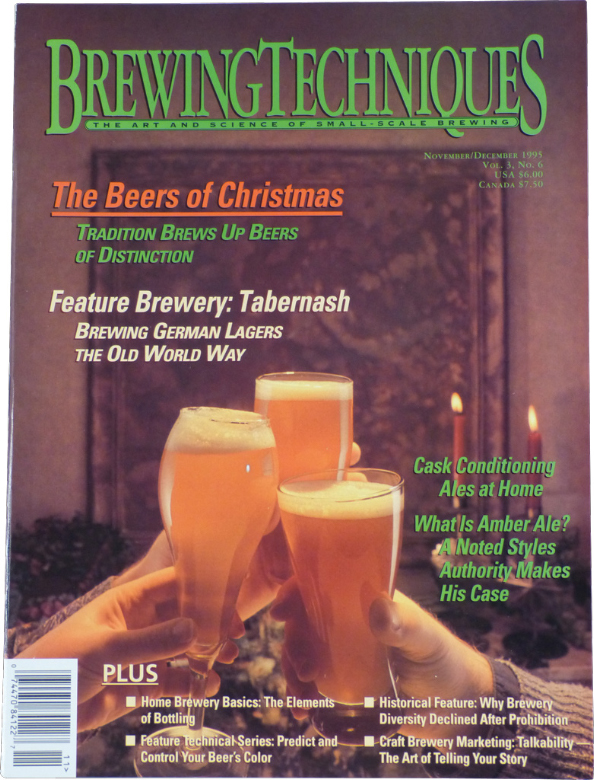 Volume 3, No. 6This issue contains:-The Beers of Christmas-Cask Conditioning Ales at Home-What is Amber Ale - A noted styles authority makes his case-Home Brewery Basics: The Elements of Bottling-Feature Technical Series: Predict and Control Your Beer's Color